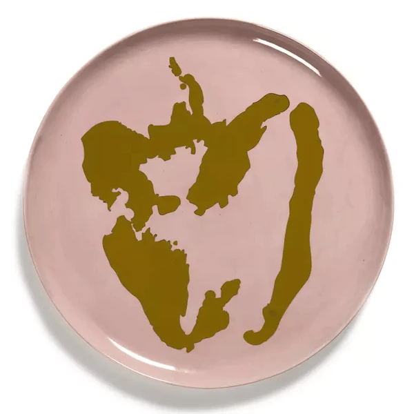 Het Serax Feast by Ottolenghi serveerbord heeft een diameter van 35 cm en is 2 cm hoog. Het aardewerken bord is roze van kleur en heeft een gouden schildering.